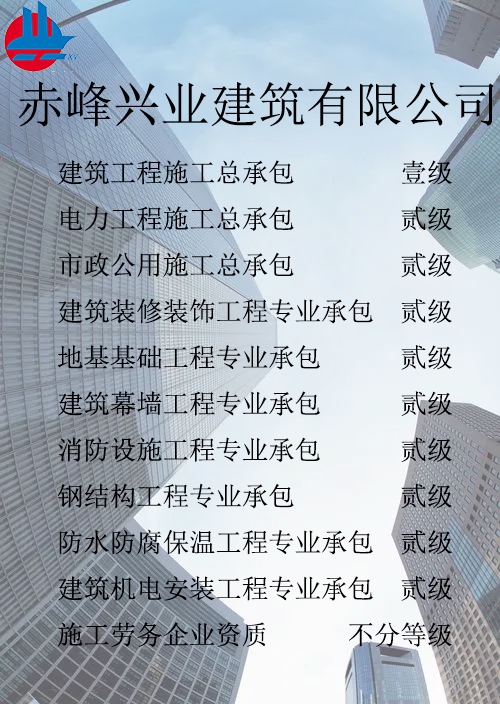 赤峰興業(yè)建筑有限公司簡介 赤峰興業(yè)建筑有限公司成立于1998年7月,位于內(nèi)蒙古赤峰市松山區(qū)?,F(xiàn)已發(fā)展成為擁有建筑工程施工總承包壹級、電力工程施工總承包貳級、市政公用工程施工總承包貳級、承裝、修、試四級、?建筑裝修裝飾工程專業(yè)承包貳級、建筑幕墻工程專業(yè)承包貳級、消防設(shè)施工程專業(yè)承包貳級、地基基礎(chǔ)工程專業(yè)承包貳級、鋼結(jié)構(gòu)工程專業(yè)承包貳級、建筑機(jī)電工程專業(yè)承包二級、防水防腐保溫工程專業(yè)承包貳級以及建筑施工勞務(wù)等資質(zhì)的綜合性建筑施工企...